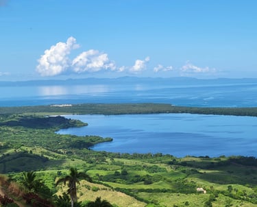 From the top of Montaña Redonda, the panorama reveals a striking contrast between land and sea. Fertile plains and tropical vegetation stretch for kilometers, forming soft, rolling hills. Beyond that appears the Caribbean Sea, calm or shimmering depending on the weather, offering a deep blue horizon line.